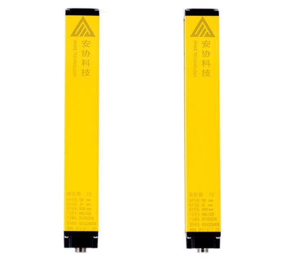 安全光柵的工作原理:紅外光柵由發(fā)射器發(fā)出,接收器接收,形成保護光幕。當(dāng)有物體通過光幕時,阻擋相應(yīng)的紅外光,光電傳感器檢測到,將光信號轉(zhuǎn)換成電信號,傳送到PLC或報警電路,實現(xiàn)設(shè)備停止或發(fā)出安全報警,確保設(shè)備的安全生產(chǎn)和操作人員的人身安全。